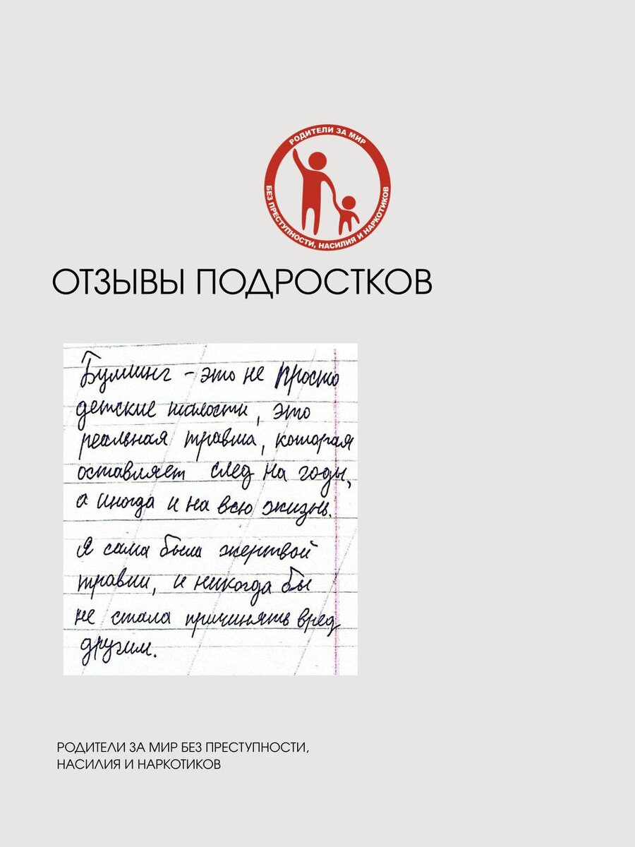 ⬇️ 1️⃣Буллинг - это не просто детский шалости, это реальная травма которая оставляет след на годы, а иногда и на всю жизнь. Я сама была жертвой травли и никогда бы не стала причинять вред другим. 2️⃣ Вредные привычки, такие как употребление алкоголя, наркотиков и курение - наносят серьезный ущерб здоровью, разрушают личность и социальную жизнь человека. Я никогда не стану портить свое здоровье ядом. 3️⃣ Узнала, что нужно уметь признавать свои ошибки. Прежде чем что-то говорить и сделать нужно сначала подумать , ведь могу быть и последствия. 4️⃣ Я поняла как защищать себя и не обижать других. 5️⃣ После урока можно задуматься о всех своих неправильных поступках. 💭 Вы можете повлиять на то, чтобы больше детей и подростков получили правильные жизненные ориентиры! 💰Станьте спонсором нашего центра: https://roditelizamir.ru/donations/