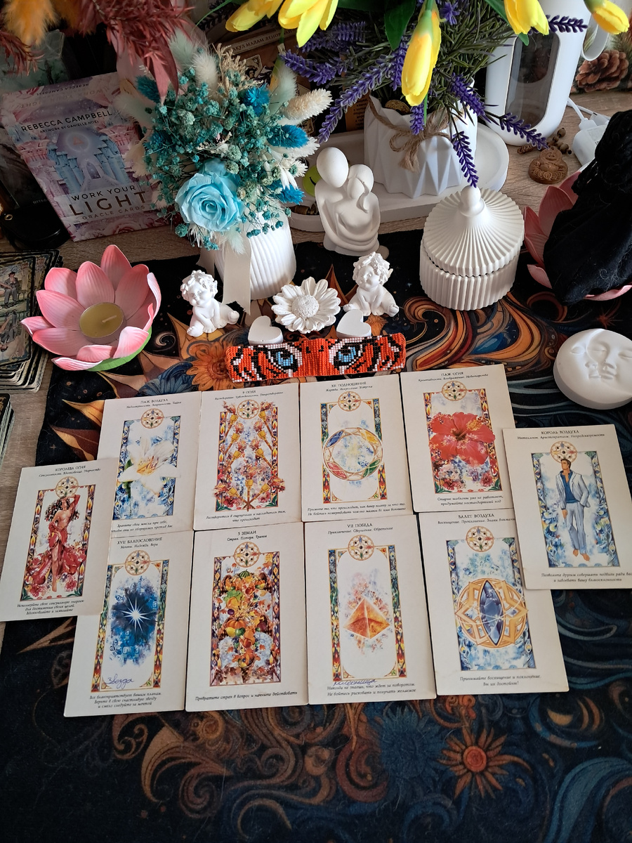 На колоде Ларисы Ренар этот расклад читается как дорожная карта подготовки к отношениям, которые будут сотканы из огненной страсти и воздушной интеллектуальности. Итоговые карты — Королева Огня и Король Воздуха — указывают на то, что к концу 2026 года вы либо сами станете этой парой (обретёте внутренний баланс), либо встретите союз, где эти две энергии соединятся в гармоничный тандем.