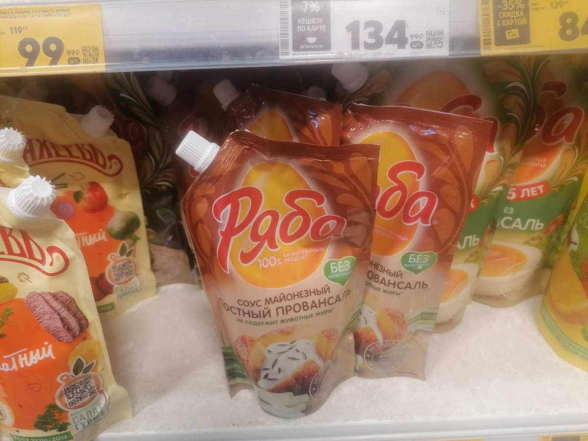 Маркетологам майонеза «Ряба» надо прямо премию выписать за талантливое придумывание названий для тех изобретений современной химии, которые они расфасовывают по ярким пачкам. В честь Великого поста в «Пятерочки» завезли в массовом порядке новое изделие этого бренда: «Постный провансаль». Только вдумайтесь еще раз – ПОСТНЫЙ провансаль! Как вообще майонез может быть постным?!! Провансаль это же растительное масло, желтки, лимонный сок, горчица, ну и соль с сахаром. А раз яичные желтки – то как же майонез может быть постным? Оказывается, может. У нас любое чудо придумают. Беру с полки упаковку этого чудо соуса, чтобы посмотреть состав. А та-а-ам! Масло подсолнечное, вода, сахар, загустители (крахмал), соль, уксус, горчица… Так вот он почему «постный»! В этот чудо-провансаль яичные желтки не положили! Справедливости ради, на упаковке честно написано «Соус майонезный». То есть вообще это как бы и не майонез, а что-то навроде майонеза :) Как и положено по ГОСТу – так как раз яиц в составе не