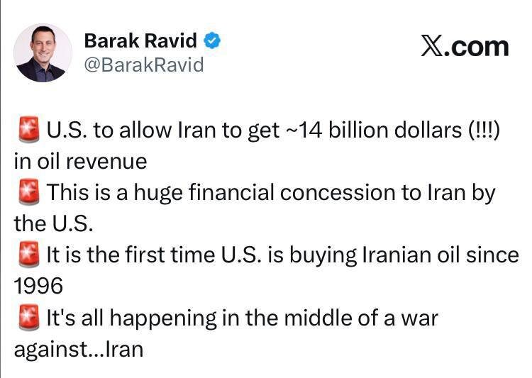 : ✔️США позволят Ирану получить около 14 миллиардов долларов дохода от нефти. ✔️Это огромная финансовая уступка Ирану со стороны США. ✔️Это первый случай, когда США покупают иранскую нефть с 1996 года. ✔️Все это происходит в разгар войны против... Ирана. 🤗 НАСОНОВ ▶️