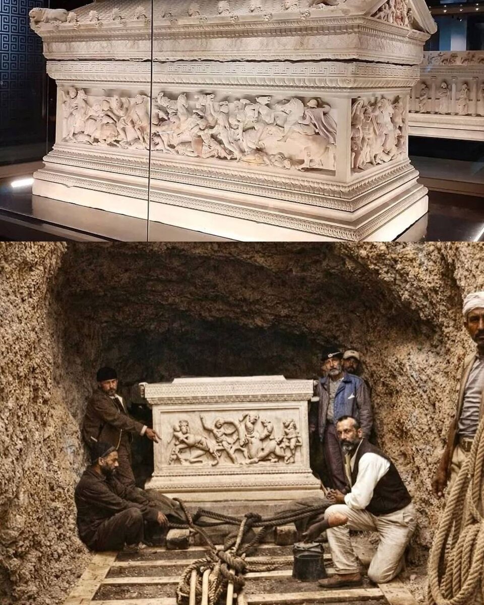 IV век до н.э. Несмотря на название, этот саркофаг, вероятнее всего, никогда не принадлежал Александру Македонскому. Исследователи считают, что он был создан для царя Абдалонима Сидонского - правителя, которого сам Александр возвёл на трон после завоевания Финикии. Обнаружен в 1887 году в ходе раскопок королевского некрополя Сидона в Ливане под руководством османского археолога Османа Хамди-бея - одного из основателей турецкой археологии и создателя Стамбульского археологического музея, где саркофаг хранится по сей день. Почему же он носит имя великого завоевателя? Потому что Александр буквально на нём изображён. Рельефы саркофага с поразительной детализацией передают сцены охоты и сражений, в которых рядом с греками и персами угадывается фигура Александра. Резьба выполнена в лучших традициях эллинистического искусства - с динамикой, анатомической точностью и следами оригинальной полихромной росписи, частично сохранившейся до наших дней. Это один из немногих античных саркофагов, на