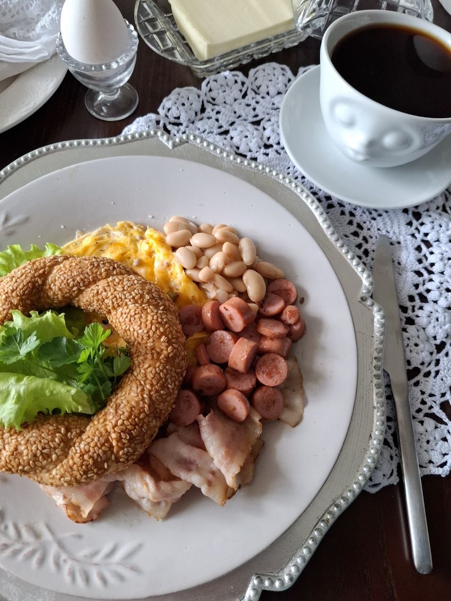 Сын ещё спит. Дом тих. За окном — серебристое утро, а я уже в эпицентре маленького кулинарного мятежа. Завтрак? Конечно, не про кашу. Сегодня — день освобождения от традиций. Ни намёка на овсянку, ни грамма манки. Только я, мои желания и сковорода, раскалённая как совесть после пятницы. На ней — скрэмбл, тот самый, что то ли французский, то ли английский, а по сути — итальянского происхождения, если верить пыльным страницам кулинарных хроник. Но кто считает? Главное — он пушистый, нежный, чуть влажный внутри. Как утро. К нему — хрустящий бекон. Американский жест, английская душа. Рядом — баварские колбаски, потому что Германия тоже имеет право на воскресенье. И белая фасоль — классика британского утра, унаследованная Америкой, как и свобода, и любовь к переработанной еде. Хлеб? Нет. Сегодня — турецкий семит, тёплый, слоёный, с куском сливочного масла, тающего по краям, как сожаление о диете. И, конечно, зелень. Много зелени. Петрушка, укроп, листья салата — мой личный антидот к жи