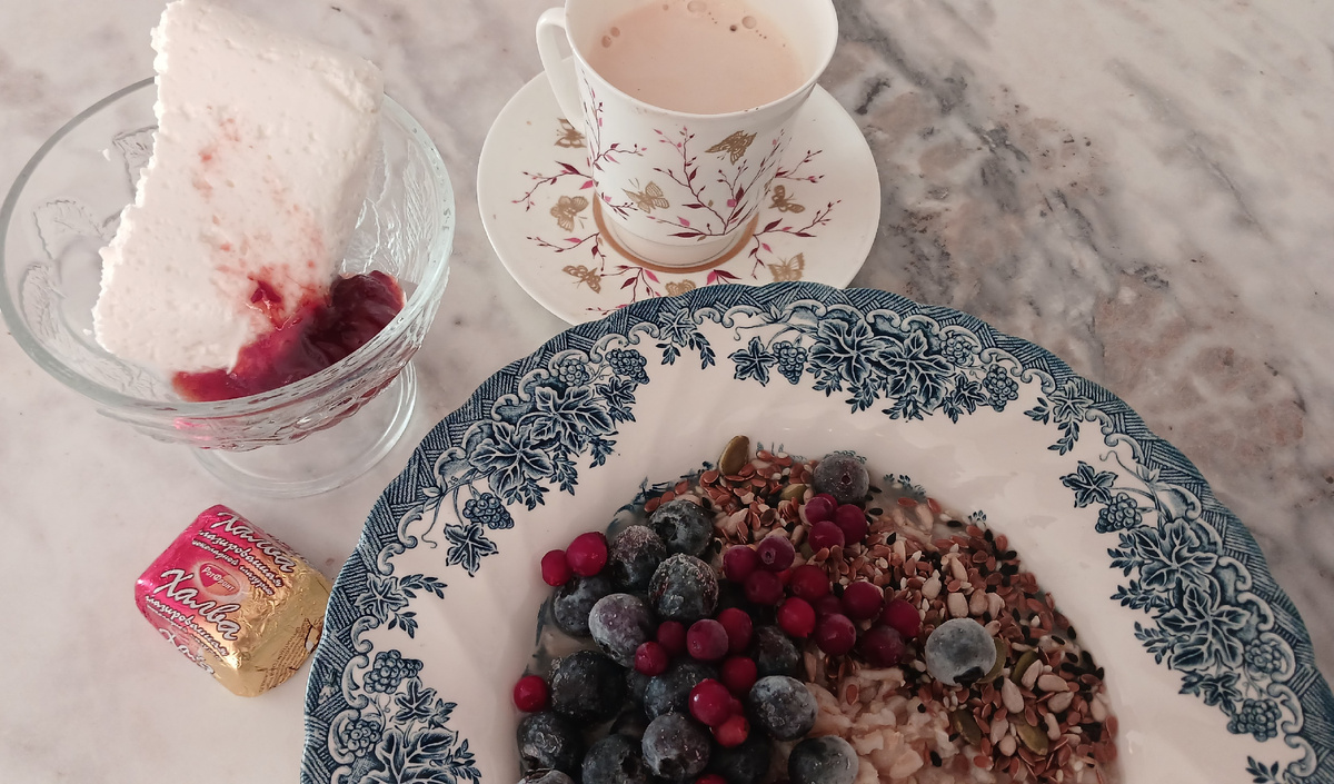 В марте питаемся на 250 руб в день на человека. Сумма в месяц на питание - 7 750 руб на одного и 15 500 руб на двоих. Завтрак сейчас такой мой самый простой и самый традиционный - овсяная каша и творог. В кашу добавила ложку семян и ягоды. У меня радость: обнаружила среди брусники еще целых 2 пакета с голубикой. 🤩 Творог с чайной ложкой сливового джема. И кофе с халвой в шоколаде. На перекус на работе каждый день беру с собой творог с ягодами. Иногда забываю про это писать. Обед: как вчерашний ужин - макароны и куриная печенка в сметанно-томатном соусе Потом выпила чашку кофе с парой брусничных зефирок Ужинала филе индейки и овощами. Индейку замариновала в специях для курицы и чуть оливкового масла добавила, потом пожарила на сковороде-гриль. И на гарнир набор овощей - брокколи, морковь, перец, помидоры. На десерт вечером - апельсин. Еще сейчас активно пью вечером мятный чай, мяту привозили из Питера от друзей, половину я сушила, вторую половину - заморозила. Сушеную мяту уже всю