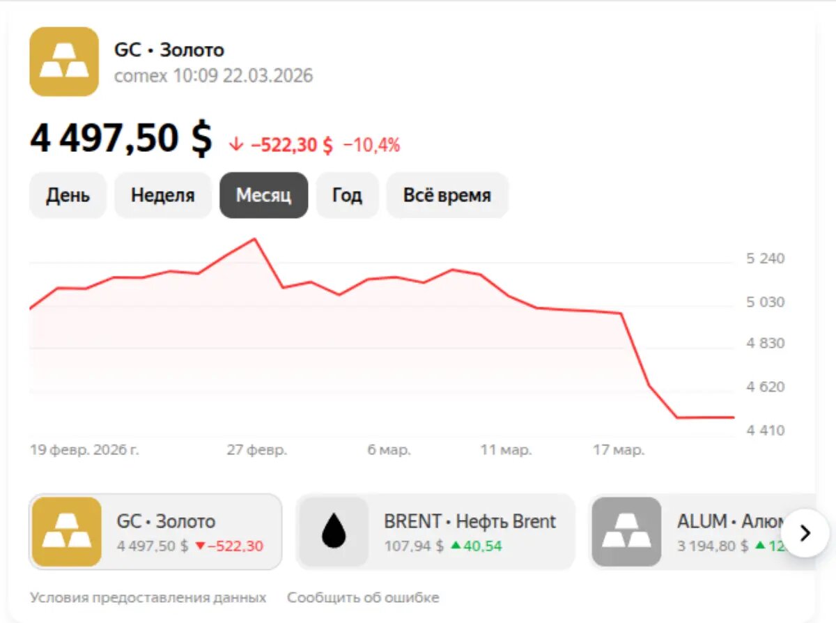 После умеренного роста накануне рынок золота показал небольшую коррекцию. По данным на 22 марта 2026 года, стоимость одной унции составила 4497,53 доллара против 4498,04 доллара днем ранее. Снижение носит технический характер и связано с фиксацией прибыли инвесторами после недавнего роста котировок. Подобные колебания типичны для рынка драгоценных металлов, особенно в условиях высокой волатильности на глобальных финансовых площадках. Дополнительное давление на золото оказало укрепление доллара на международном рынке. При росте американской валюты привлекательность золота может временно снижаться, так как металл становится дороже для держателей других валют. При этом фундаментальные факторы поддержки сохраняются. Интерес к золоту по-прежнему поддерживается инфляционными ожиданиями и осторожной позицией инвесторов на фоне решений ведущих центробанков, включая Федеральную резервную систему США. Эксперты отмечают, что текущие колебания не меняют общего тренда, а рынок остается чувствительн