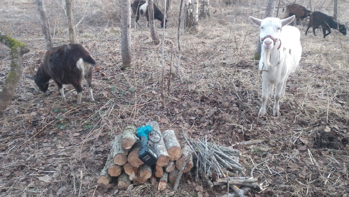 Вчера луг вдоль реки залило настолько, что даже наши водоплавающие козы больше не могут там пастись, поэтому пошла с ними в рощу позади заброшенных деревенских участков - они ели, а я приглядывала, и заодно дровишки делала.