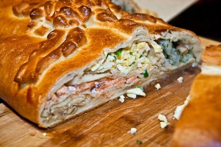 7. Перед тем как ставить в духовку, смажьте поверхность кулебяки крепкой сладкой чайной заваркой или смесью растительного масла с водой — это даст румяную и блестящую корочку.