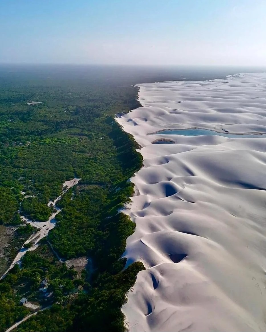 Фото было сделано на северо-востоке Бразилии, в штате Мараньян. Это место кажется нереальным. Здесь, в национальном парке Ленсойс-Мараньенсис, белоснежные песчаные дюны сталкиваются с зеленой растительностью и влажными экосистемами. Как будто граница между двумя разными мирами! Источник: Coronado26.
