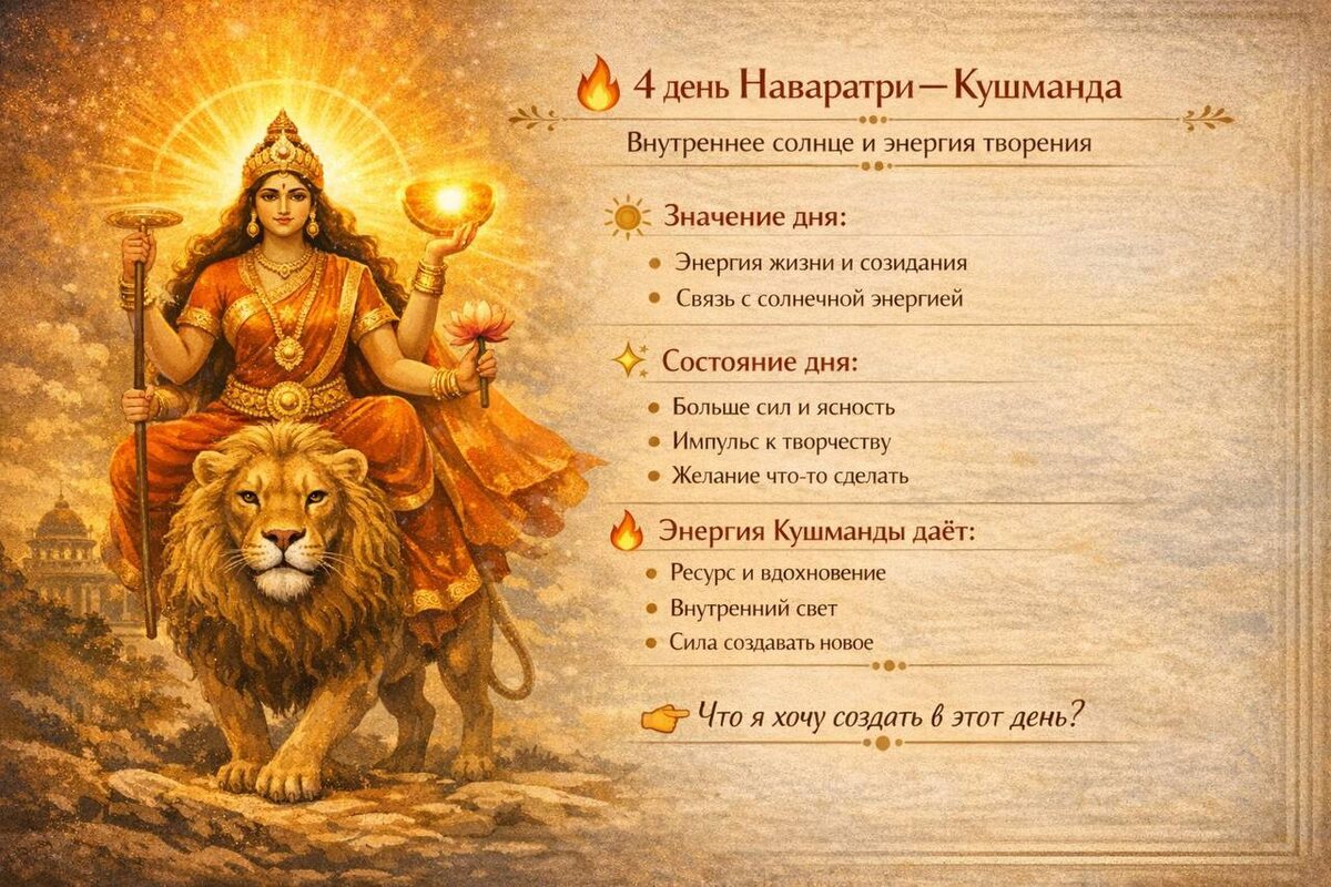 Про внутреннее солнце, энергию жизни и силу создавать 🌸 Четвёртый день посвящён Богине Кушманда. Считается, что именно она создала Вселенную — лёгкой улыбкой, изнутри себя. Это очень красивый образ: 👉 не через усилие 👉 не через борьбу 👉 а через внутренний свет 🌿 Значение в традиции В классике ей приписывают: энергию творения и жизненной силы (праны) - связь с солнечной энергией - наполнение энергией и ресурсом - способность «зажигать» жизнь внутри Это та энергия, из которой всё рождается. ✨ Про что этот день на самом деле Если первые дни — это опора, путь и баланс, то здесь включается: 👉 жизнь начинает наполняться энергией Это день, когда внутри может появиться: - больше сил - ясность - желание что-то делать и создавать Как будто внутри включается солнце 🌞 🌿 Как это проявляется в жизни В этот день Вы можете почувствовать: - прилив энергии - вдохновение - желание что-то начать или реализовать - лёгкость в теле и мыслях Но важно: 👉 не расплескать эту энергию хаотично 🔥 Что