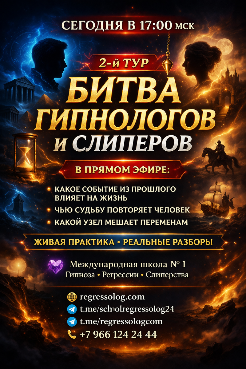 🔥 УЖЕ СЕГОДНЯ 22 МАРТА • 17:00 (МСК) 💥 2-й тур БИТВЫ ГИПНОЛОГОВ И СЛИПЕРОВ Это не теория — это живая работа в прямом эфире. 🧠 Реальные кейсы ⚡️ Точность без догадок 🔮 Ответы через Высшее Я Готовы увидеть настоящий уровень? 💜 Международная школа № 1 Гипноза • Регрессии • Слиперства 🌐 regressolog.com 📲 t.me/schoolregressolog24