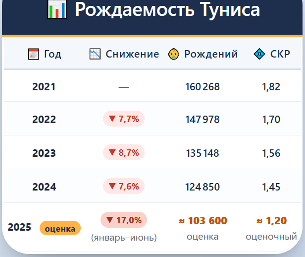 За первый квартал 2025 года падение рождаемости в Тунисе составило около 8 процентов, достигнув СКР в 1.31. Такая динамика была вполне ожидаемой: за последние 10–15 лет подобные темпы снижения стали нормой для многих мусульманских стран, в том числе и для Туниса. Но за первое полугодие 2025 года темпы падения неожиданно ускорились до 17 процентов. Если такая динамика сохранится весь год, то фертильность Туниса провалится до уровня 1.2. Особенности демографического перехода Как много раз упоминалось на канале, особенность демографического перехода в мусульманских странах заключается в том, что он происходит намного быстрее, чем в европейских. То, на что Европе требовалось 60 лет, исламские страны проходят за 10-15. И даже достигнув низких показателей рождаемости в 1,4-1,5, страны не демонстрируют замедления спада. Но Тунис даже в таких условиях удивил. Падение здесь не только не замедляется, а наоборот - ускоряется. Это уже больше похоже на обвалы, которые мы видели в странах Юго-Восточ