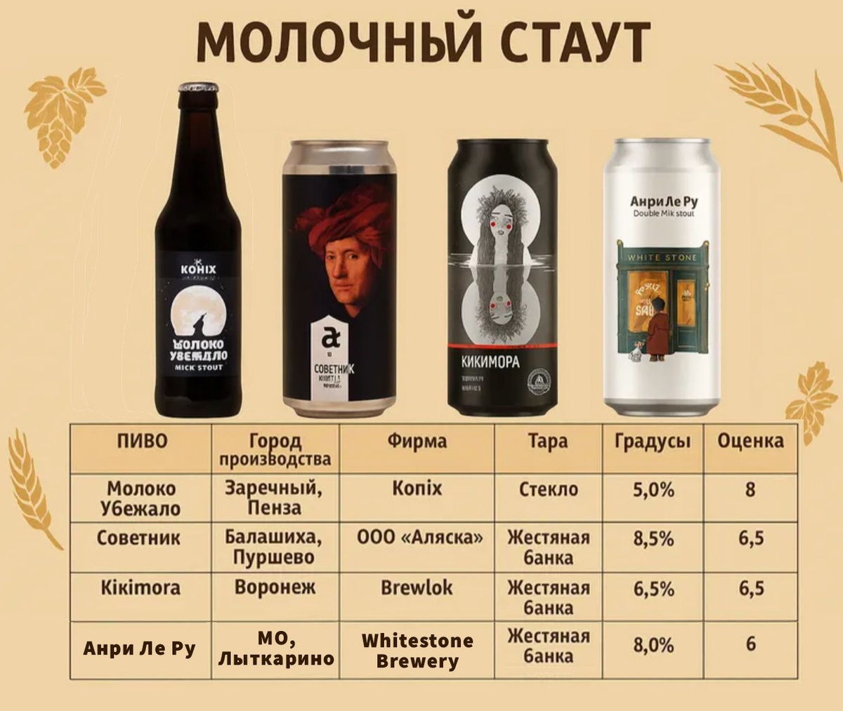 Не успел Батя отойти от не самых вдохновляющих по сути и вкусу стаутов, как был заверен, что Молочный Стаут, если и не выше всяких похвал, то очень рекомендуем к употреблению. Его главное отличие от стандартного стаута состоит в добавлении лактозы, т.е. сахара, извлечённого из молока. Пивные дрожжи не способны полностью его ферментировать, поэтому он остаётся в пиве и создаёт ощущение сладости и более плотной структуры. Найти подобное пиво в масс-маркете было почти невозможно, поэтому все конкурсанты являются представителями крафтового пивоварения: 🍺Советник 🍺Анри Ле Ру 🍺Молоко убежало 🍺Kikimora Его запах невероятно приятен, при открытии баночки он сразу бросает тебя в нокаут своей сладостью карамельностью, аж слюнки потекли, поэтому его сразу хотелось попробовать. После первого глотка быстро приходит понимание нестабильного вкуса. Он прям скачет во рту как на батуте, и ты озадаченно пытаешься понять, что ты вообще пьешь. Затем думаешь, осознаешь, рефлексируешь, и в итоге понимаешь