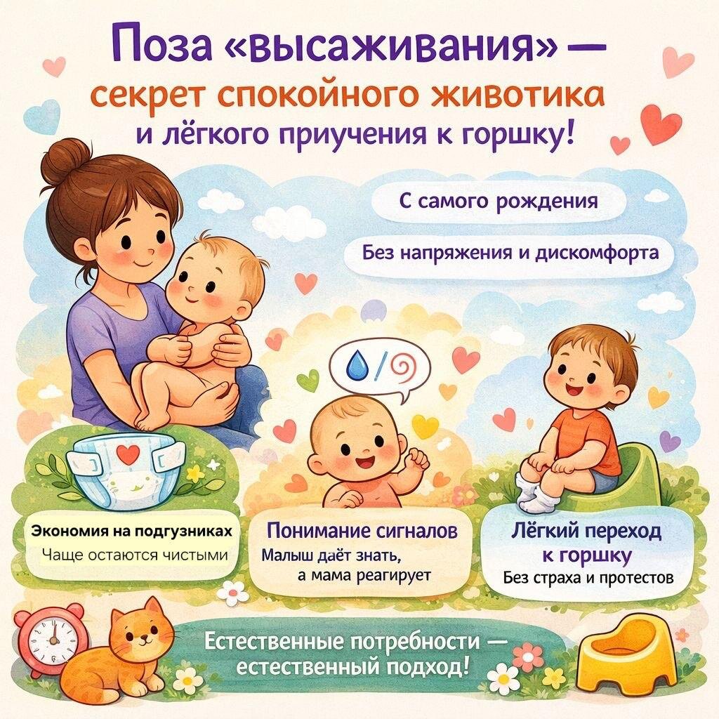 Многие мамы впервые слышат о позе «высаживания» уже после рождения малыша — и часто удивляются, насколько это естественный и простой инструмент. Давайте разберёмся! 🙂 🔹 Что такое поза «высаживания»? Это физиологичное положение малыша, при котором взрослый поддерживает его под бёдра (или под колени), слегка прижимая ножки к животику. Спинка при этом округлена, таз находится в положении, удобном для естественного опорожнения. По сути — это та поза, в которой малыши интуитивно легче выводят газы, писают и какают. 🔹 Зачем она нужна и когда начинать? Использовать позу можно с самого рождения. Она помогает: ● снизить дискомфорт при газах и коликах; ● облегчить процесс мочеиспускания и дефекации; ● лучше понимать сигналы малыша. Важно: это не «обучение» и не «приучение», а отклик на потребности ребёнка. 🔸 Какие ассоциации формируются у малыша? Когда мама регулярно помогает малышу через эту позу, у него формируются очень важные связи: ● «Я чувствую позыв → мне помогают → становит