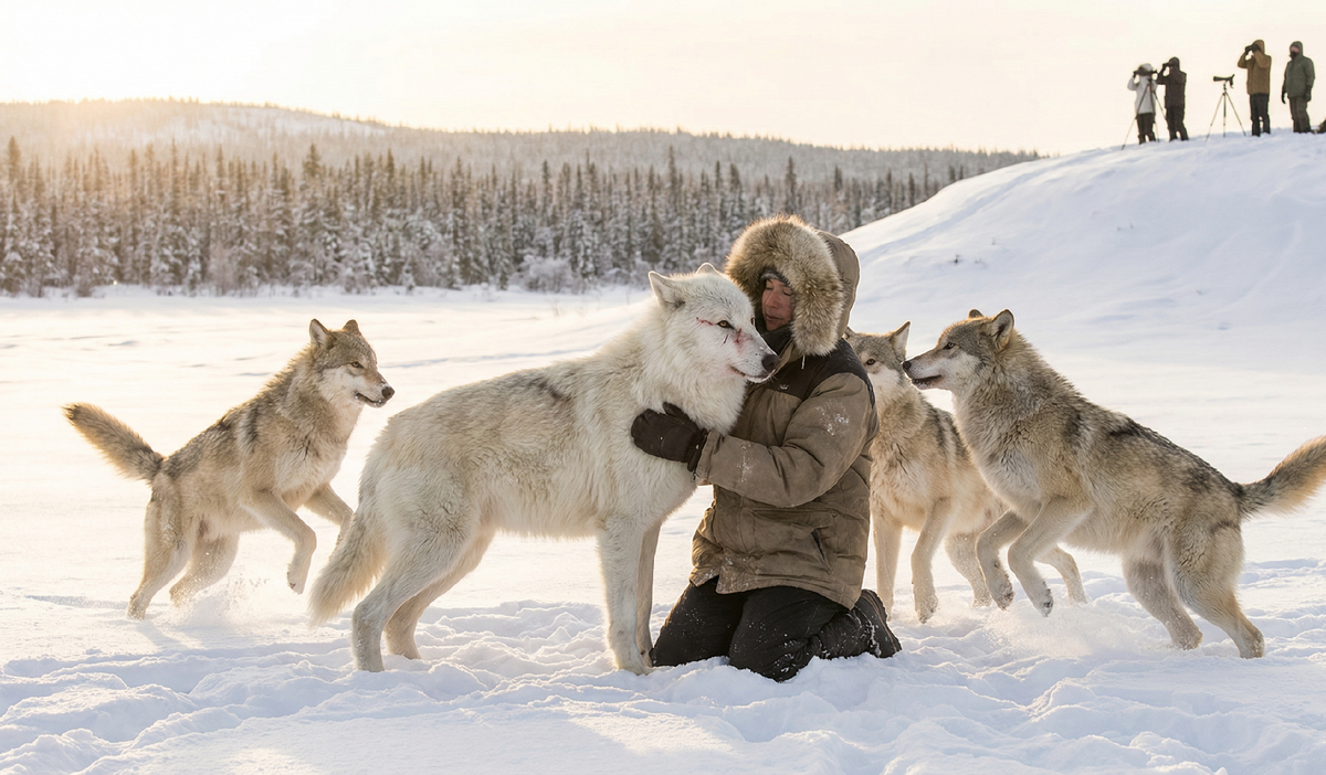 Исследователи на холме стояли в полном оцепенении, наблюдая за тем, как одинокий путник обнимает огромного вожака за могучую шею, зарываясь лицом в густую серую шерсть. Волки кружили вокруг них, поднимая в воздух пушистые тучи искрящегося снега. Это была сцена абсолютной, чистой любви и невероятной связи между человеком и суровым миром природы.