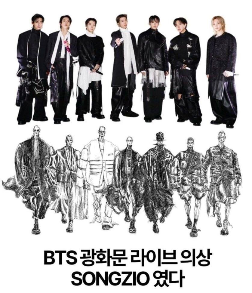 BTS предстали перед зрителями в индивидуально созданных образах от бренда Songzio, в которых традиционный корейский костюм сочетался с авангардным дизайном. О создании костюмов для камбэк-шоу BTS “Arirang” рассказал Джей Сонгзио в интервью WWD (Women's Wear Daily (WWD) — торговый журнал индустрии моды, который часто называют «Библией моды»): Я выстроил повествование, в котором участники это герои, проходящие через трудные времена к лучшему будущему. Отсюда родилась идея доспехов, но с элементом текучести. Ханбок помог реализовать это благодаря своей лёгкости и естественной пластике. Мы стремились создать историю, в которой участники становятся своего рода героями и воинами, преодолевающими бурные времена и прокладывающими путь к лучшему будущему. Общая концепция родилась из идеи «эмоционального исцеления», ведь музыка – это прежде всего эмоция. Я опирался на корейское понятие han - сочетание печали и тоски, глубоко связанное с историей Кореи, прошедшей через войны и преодоление труднос