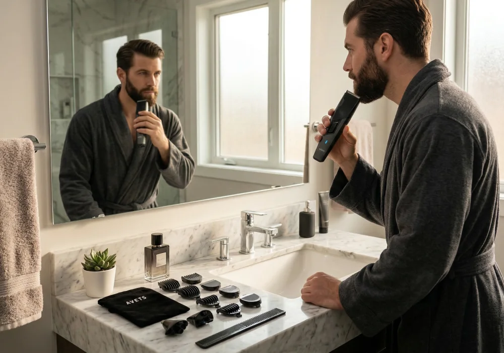 Идеальный вариант — когда в триммере предусмотрены оба способа. Например, в AVETS есть насадка, которая крепится на лезвие и позволяет плавно регулировать длину от 3 до 7 мм. А для тех, у кого борода длиннее, в комплекте есть отдельные насадки на 9, 10 и 12 мм. Это закрывает практически все потребности.