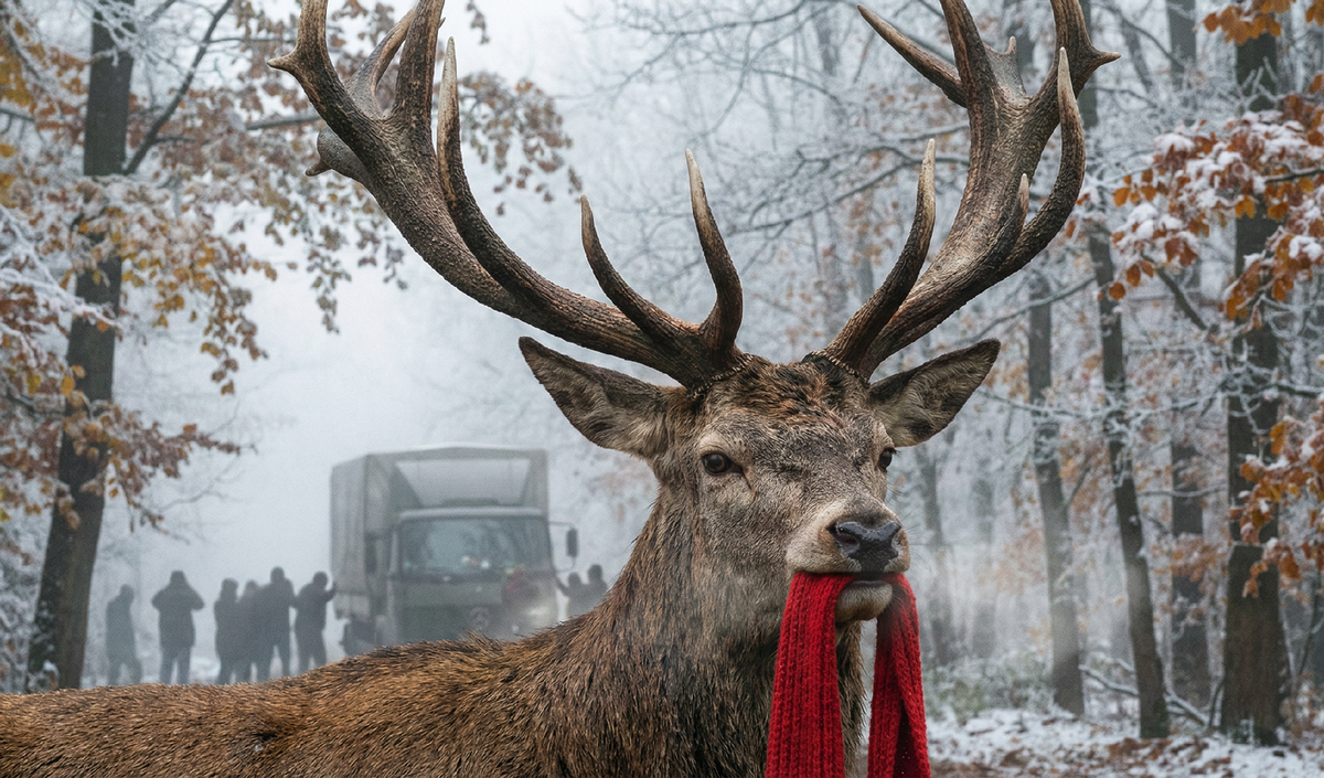 В свете фар было отчетливо видно, что на ветвистых рогах оленя намотан ярко-красный шарф, совершенно чужеродный предмет в этом диком лесу.