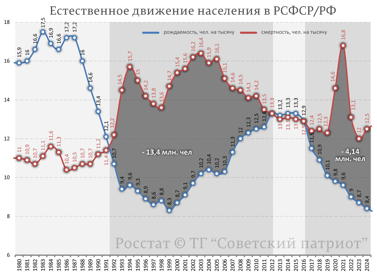 Снова я возвращаюсь к теме, которая меня волнует: к продолжающемуся уже 35 лет физическому вымиранию российского народа. После распада СССР и перехода к капитализму в России резко возросла смертность и упала рождаемость, что привело к так называемому демографическому кресту. Однако позднесоветские демографические прогнозы не предвидели такого развития событий и ожидали дальнейшего роста населения России, по крайней мере, до 2015 года. Таким образом, существует причинно-следственная связь между отказом от социализма, переходом к капитализму и начавшимся физическим вымиранием народа России. Эту связь яростно отрицают некоторые демографы, которые работают в интересах бенефициаров развала СССР и крупного капитала. Тем не менее, эту связь можно увидеть не только на примере нашей страны, которая является сложной по национальному составу и уровню развития разных народов, но и на примере таких стран, как капиталистическая ФРГ и социалистическая ГДР. В ГДР смогли справиться со снижением рождаем