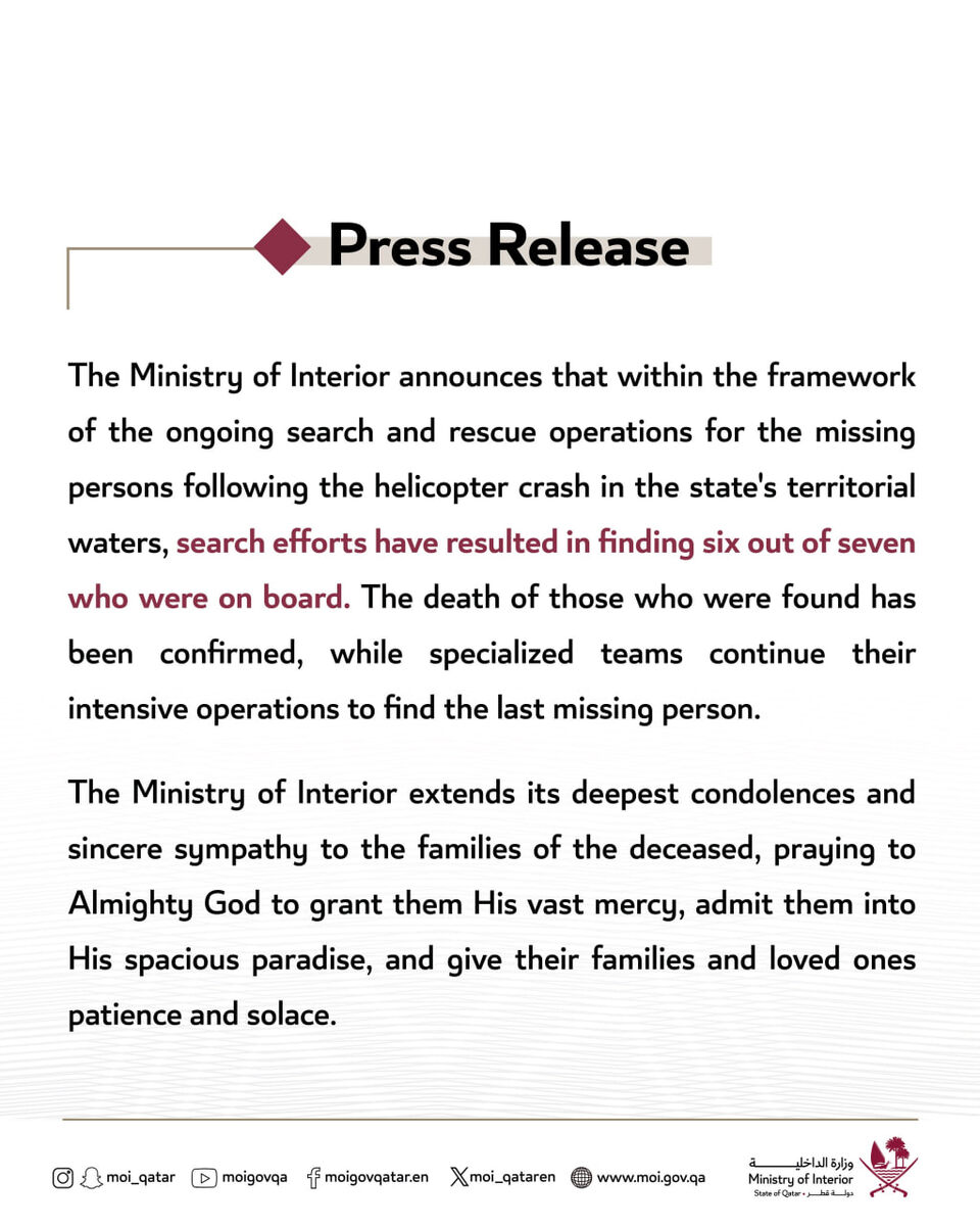 6 KILLED in helicopter crash in Qatar’s territorial waters after 'technical malfunction' — Qatari Interior Ministry