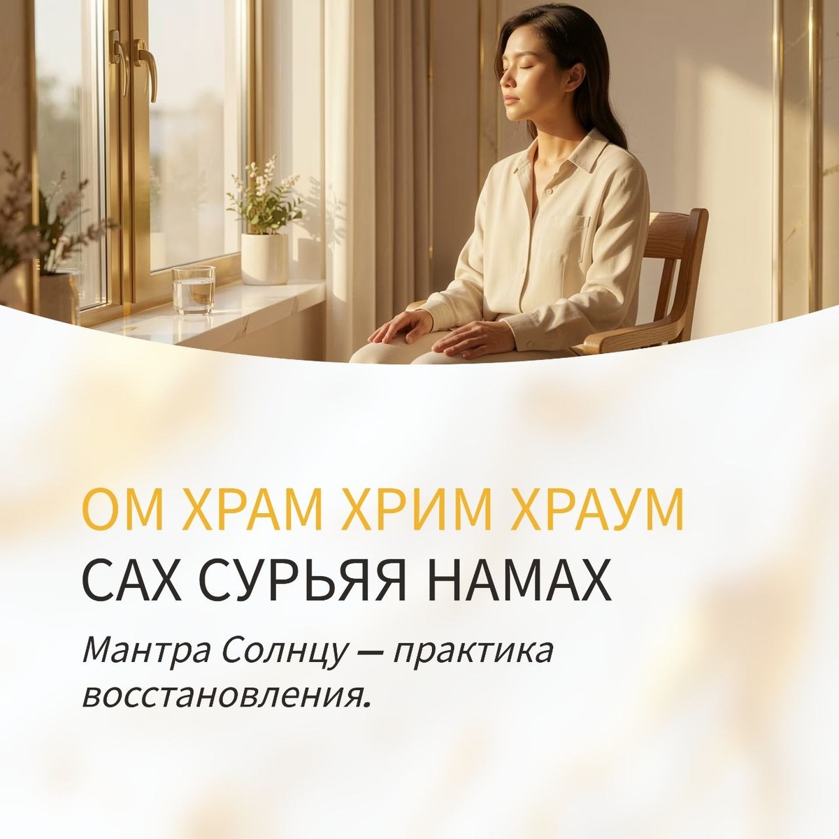 : https://dzen.ru/media/id/679874a5803cfd24aa1ac3d1/astropsihologiia--chetverg-praktika-69bb7712380aa01b0921b6f5 ). Мантра Солнцу «ОМ ХРАМ ХРИМ ХРАУМ САХ СУРЬЯЯ НАМАХ» 🔠. Фокус внутри мантры Биджа Как работать для восстановления ХРАМ Центр жизненной энергии (Манипура). Представляйте, что с каждым повторением в солнечное сплетение вливается густой золотой свет, как после глубокого отдыха. ХРИМ Сердечный центр. Восстанавливает способность радоваться, убирает эмоциональное истощение. Дышите мягко, с ощущением «теплого раскрытия» в груди. ХРАУМ Горловой центр + защита. При упадке сил часто страдает воля; этот слог возвращает внутреннюю опору, чтобы энергия не утекала в чужие дела. САХ Личная целостность. Восстанавливает чувство «я есть», которое размывается при хронической усталости. Важно: не старайтесь произносить мантру громко и агрессивно. Лучше её читать тихим, ровным голосом или мысленно, с долгими выдохами — так энергия усваивается, а не расходуется. 🔠. Режим практики Время: ут