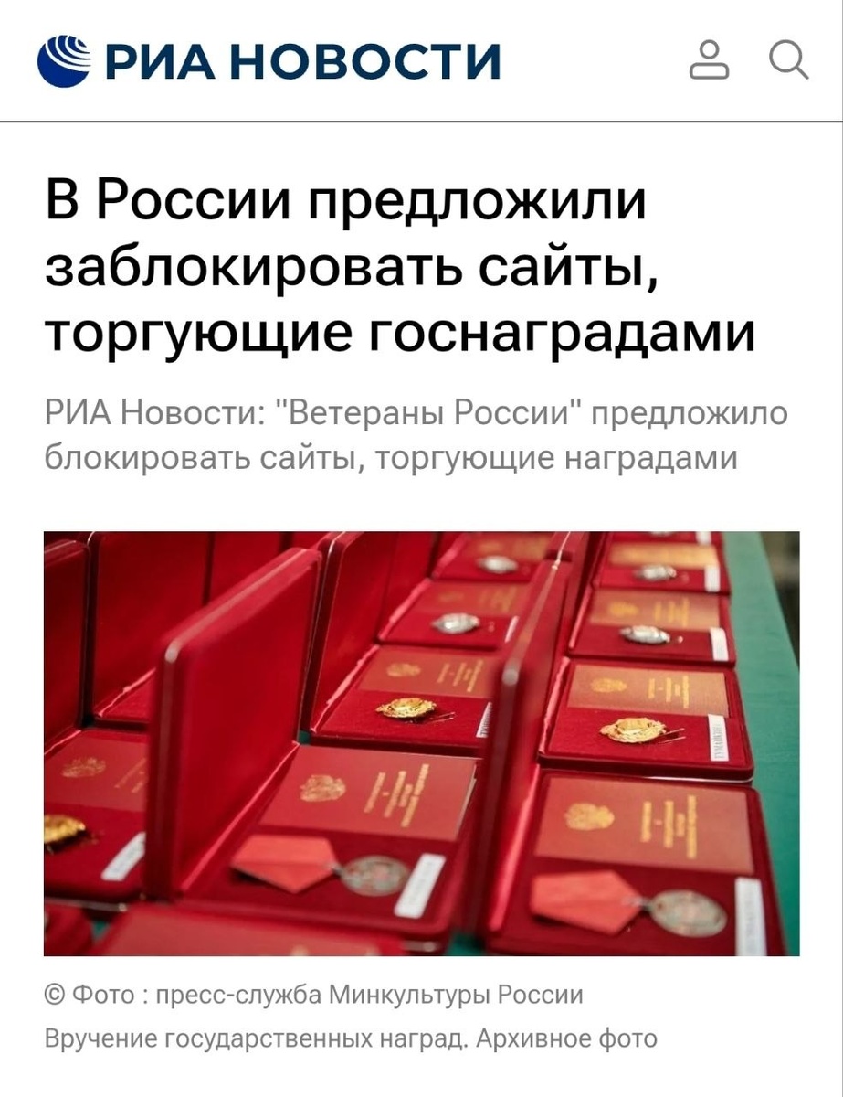 1 мар - РИА Новости. Общероссийское общественное движение "Ветераны России" предлагает заблокировать в РФ интернет-ресурсы, торгующие государственными наградами, сообщил РИА Новости председатель движения Ильдар Резяпов.