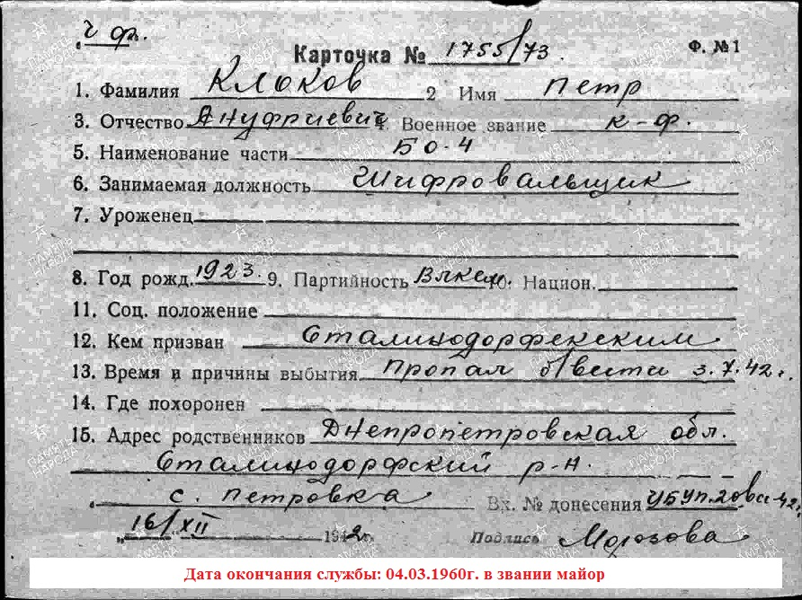 Николай Птицин Поиски информации часто приводят в замешательство. Не знаешь чему верить. Вот и судьба этого авиатора сделала крутой поворот. Участник обороны Севастополя пропал без вести в период вывода войск 3.07.1942г. Даже в книгу памяти его занесли на странице 117. В карточке учета №1555/73: шифровальщик БО-4 Гвардии краснофлотец Клоков Петр Ануфриевич числится, как пропавший без вести 3.07.1942г. Карта заполнена 16.12.1942г. И никто не посмотрел, что он жив и с 8 июля 1942г. служит в 62 иап ВВС ЧФ. Обычно, когда такое случается, то на оборотной стороне карточки делают запись. Что он жив и куда отправлен для дальнейшего прохождения службы. Здесь такого нет. Начинаем распутывать кадровый узел. Хочу сразу напомнить древнее поверье: тот, кого считали усопшим, проживет долго и счастливо. Надеюсь так оно и было.