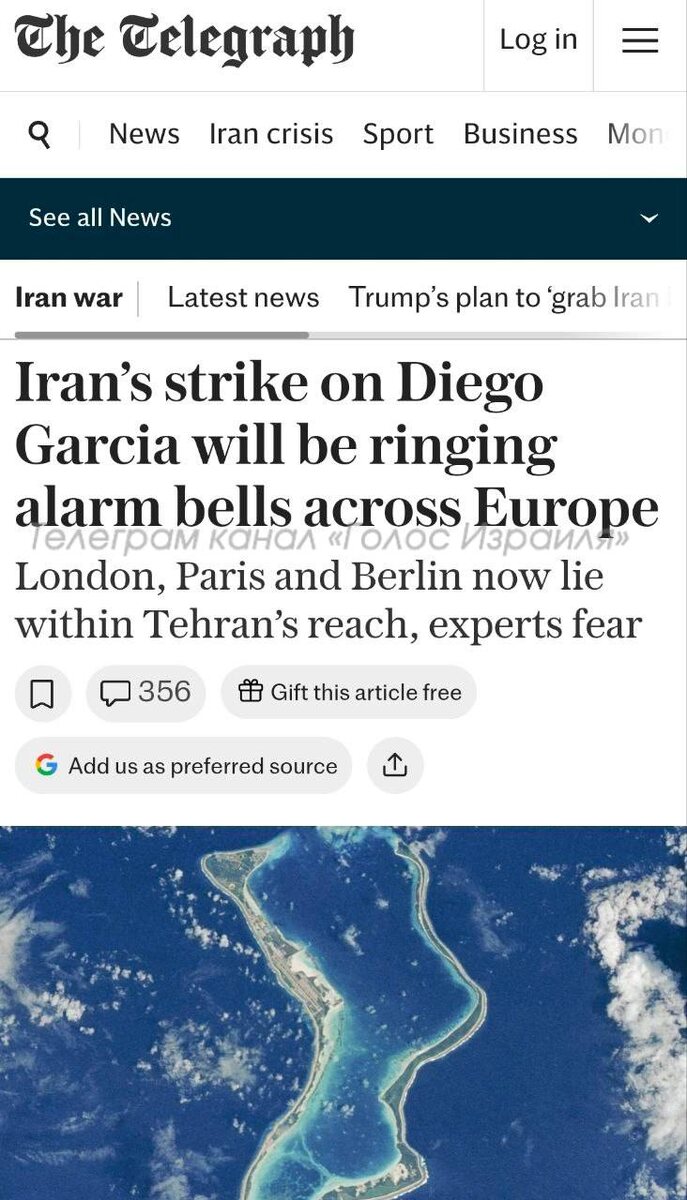 ⚡️The Telegraph: «Атака Ирана на Диего-Гарсию станет «будильником» для Европы. Лондон, Париж и Берлин находятся в зоне досягаемости иранских ударов».