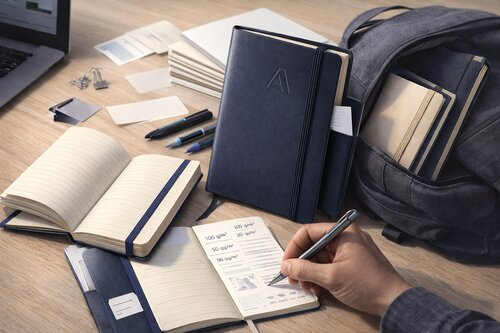 Если блокнот нужен для встреч, планёрок, быстрых записей и заметок в дороге, наиболее рабочими форматами остаются A5 и A6. A5 даёт достаточно места для списков задач, схем, контактных данных и пометок по проектам, при этом без проблем помещается в рюкзак, деловую сумку или папку. A6 выигрывает по компактности: его удобно носить постоянно, но для длинных записей, рабочих таблиц и детальных заметок он уже заметно теснее. Формат A4 в корпоративной раздаче обычно менее выгоден: он занимает много места, неудобен вне офиса и редко становится постоянным рабочим инструментом.