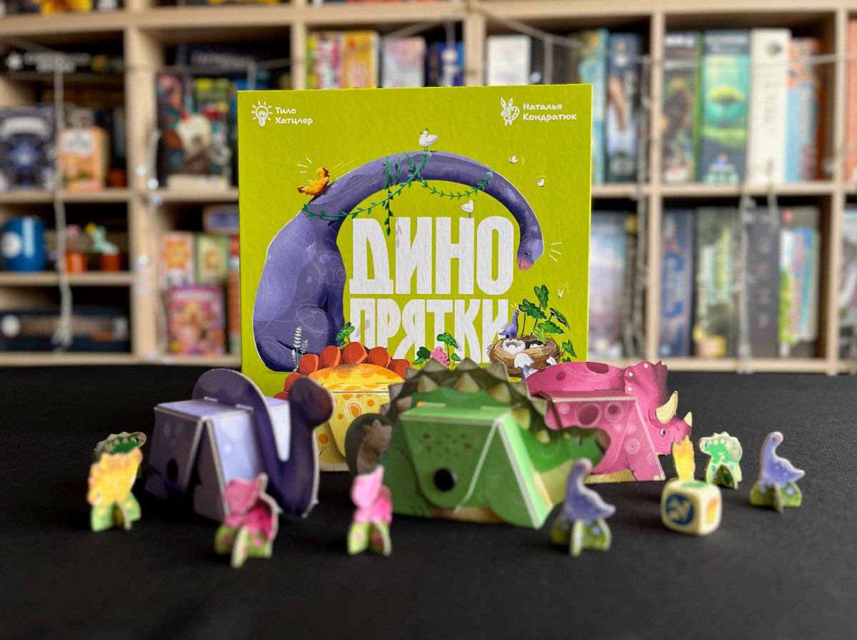 Младший у меня наконец стал проявлять настоящий интерес к настольным играм. Он играл со мной по чуть-чуть в разное, были у него особые любимчики, но вот так, чтобы сам предлагать, такое случалось редко. И вот недавно он стал сам брать коробки, просить поиграть, вчера обучал дедушку новым правилам, причём прекрасно их рассказывал. После партии сам всё убрал, ну просто чудо. И очень хорошо у нас зашла последняя партия детских новинок, одна из них – «Динопрятки». Тут уже и старший неожиданно подключился, хотя я думала, что мемори-игры – это уже вообще не его формат, но в хорошей компании хочется пробовать всё. У вас есть четыре диномамы, под каждой из них прячутся детёныши разных цветов. В свой ход вы бросаете кубик и выполняете выпавшее действие: либо ищете конкретного динозаврика под мамой, либо забираете любого, либо берёте одного, а двух других меняете местами. Игра заканчивается, если на кубике выпадает динозаврик, которого больше нет ни под одной мамой или игрок поднимает диномаму,