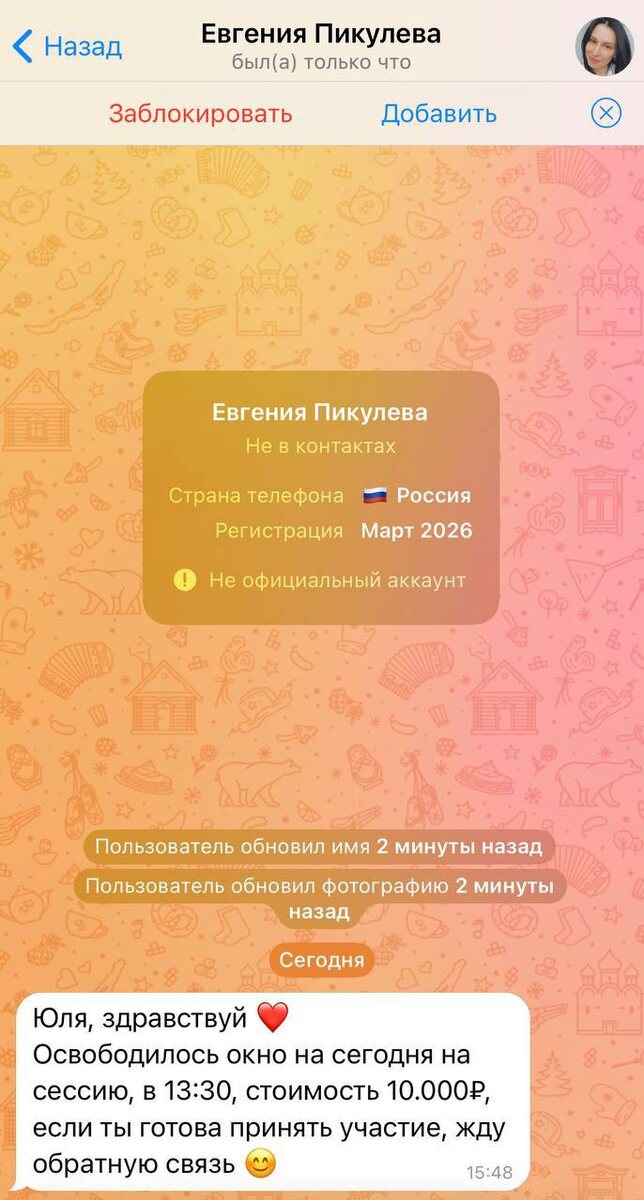 !!!! Если вам пришло вот такое сообщение, это не Я. Не реагируйте! Не отвечайте! Не переводите деньги! Я не пишу никому с предложениями о сессии за деньги! Номер админа 905-171-00-99, в аккаунте администратора всегда указан номер!!! Не общайтесь с аккаунтом, где номер не указан!