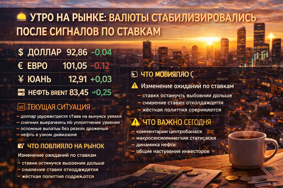 После вечернего роста волатильности рынок утром перешёл в фазу стабилизации. Основные валюты торгуются без резких движений, а инвесторы заняли выжидательную позицию перед новыми сигналами. 📊 Текущая ситуация На утренних торгах: — доллар удерживается вблизи достигнутых уровней после вчерашнего укрепления