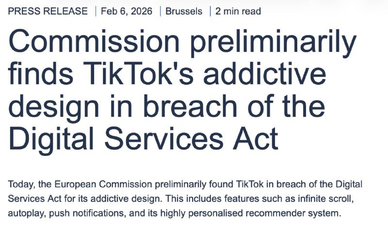 ! Теперь им придется менять дизайн, потому что, по мнению комиссии, их бесконечные рекомендации и автозапуск видео вызывают зависимость у пользователей. Если TikTok не сможет доказать, что это не так, или не обновит интерфейс, им грозит штраф до 6% от глобального дохода. Вот это поворот! #Techtaim