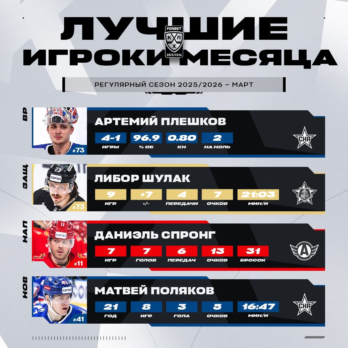КХЛ определила лучших игроков заключительного месяца регулярного сезона 2025/2026.