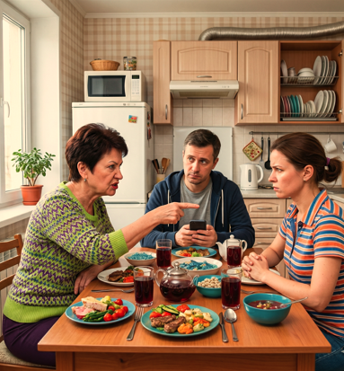 В воскресенье вечером небольшая гостиная наполнилась гулом голосов. На столе красовалось мясо под сырной шапкой, в хрустальных бокалах темнел вишневый сок. Тамара Ильинична пришла последней. Увидев за столом всех троих сыновей с женами, она на мгновение замерла в дверном проеме. Ее взгляд подозрительно забегал, но она быстро натянула привычную маску радушия.
