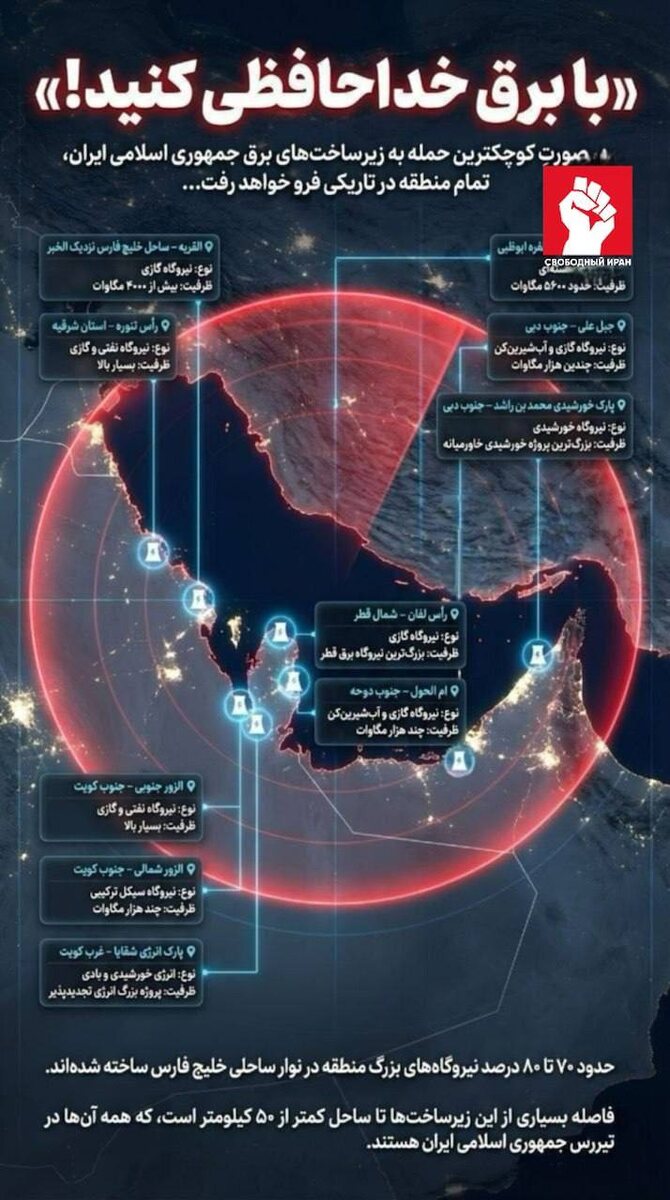 ⚡️ Агентство на фоне напряжения на Ближнем Востоке вывесило постер с электростанциями в 🇸🇦 Саудовской Аравии, 🇦🇪 ОАЭ, 🇶🇦 Катаре и 🇰🇼 Кувейте — намек на ответные удары читается без перевода. Подпишитесь на канал Подпишитесь на канал