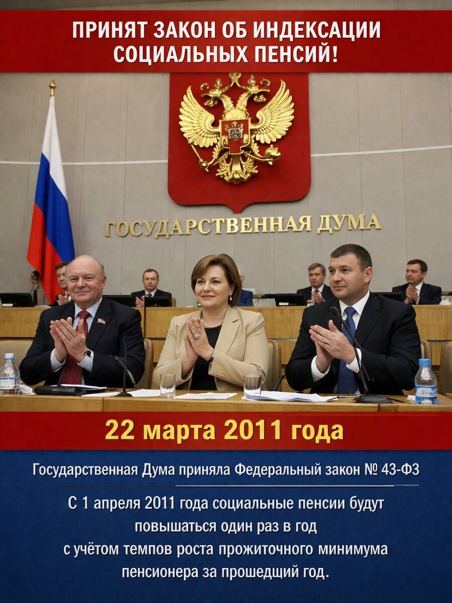Принят закон, установивший единую дату индексации социальных пенсий (2011 год) 22 марта 2011 года Государственная Дума приняла Федеральный закон № 43-ФЗ, который изменил правила индексации социальных пенсий . Согласно документу, с 1 апреля 2011 года такие пенсии стали повышать один раз в год с учетом темпов роста прожиточного минимума пенсионера за прошедший год. Закон вступил в силу 28 марта, а его действие распространили на правоотношения, возникшие с 1 апреля 2011 года .