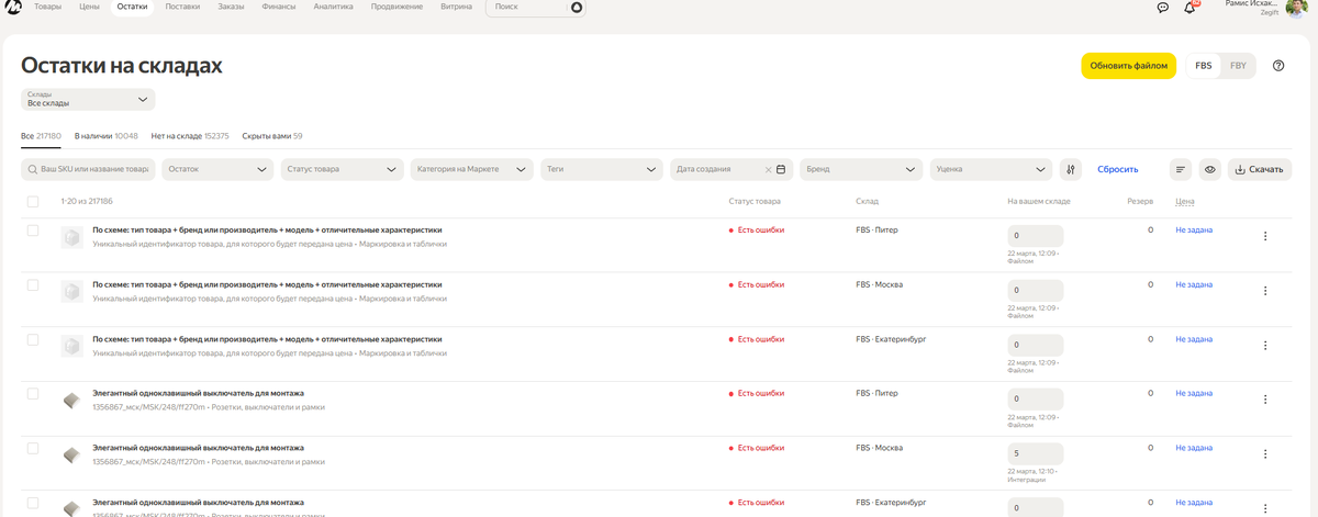 Почему так важно обнулять остатки в Яндекс Маркете, если у вас интеграция с ВБ остатков, если вы удалили товар в ВБ то вы не сможете обнулить остаток в Маркете так как этого артикула больше нет поэтому он не облиться. 1. Заходим в раздел , кликаем в "Обновить файлом". 2. Выходит меню 3. Мы загружаем файл ексель с любым с нулевым остатком и выбираем "Полностью" и обнуляем все товары которых нет даже в файле так, как все обнуляется.