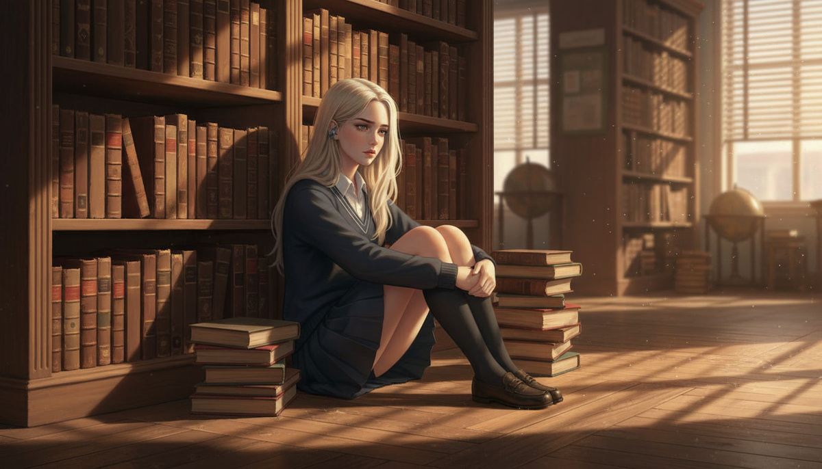 Ранее: Лера и Марк нашли тайник под сценой — наследие её бабушки и его тёти. Внутри оказалась шкатулка с её именем и сейф с акустическим замком. Но Марк что-то скрывает. А Саша снова прячется от мира, который требует слишком многого. Школьная библиотека в поздний час напоминала не просто хранилище книг, а самый настоящий заброшенный архив, законсервированное во времени пространство. Пыльные лучи заходящего солнца пробивались сквозь щели старых жалюзей, расчерчивая длинными полосами потертый паркет, стопки непрочитанных книг и покрытые паутиной глобусы в углу. На бесконечных полках, словно немые забытые солдаты на параде, выстроились в безупречный ряд потрёпанные тома в старых переплётах с выцветшими, почти нечитаемыми корешками. Некоторые из них были густо затянуты серебристой паутиной, другие — раскрыты на середине и брошены, будто кто-то в спешке вырвал из них нужные страницы, оставив лишь обрывки чужих мыслей и незаконченные истории. Саша сидела в самом дальнем, самом тёмном углу, з