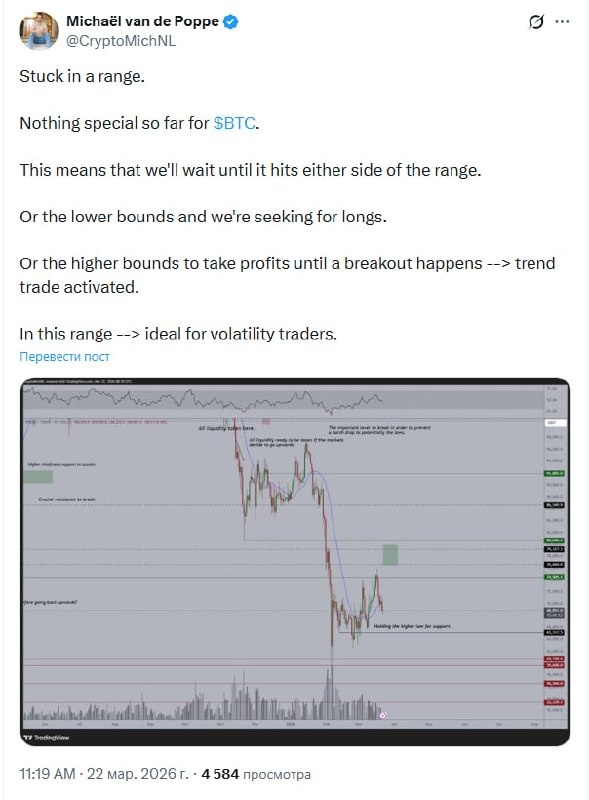Пока ничего особенного для BTC. Это означает, что будем ждать, пока цена достигнет одной из границ диапазона. Либо нижней границы, и тогда будем искать лонги. Либо верхней, чтобы зафиксировать прибыль до момента пробоя → активируется трендовая торговля. В этом диапазоне → идеально для трейдеров, работающих с волатильностью.
