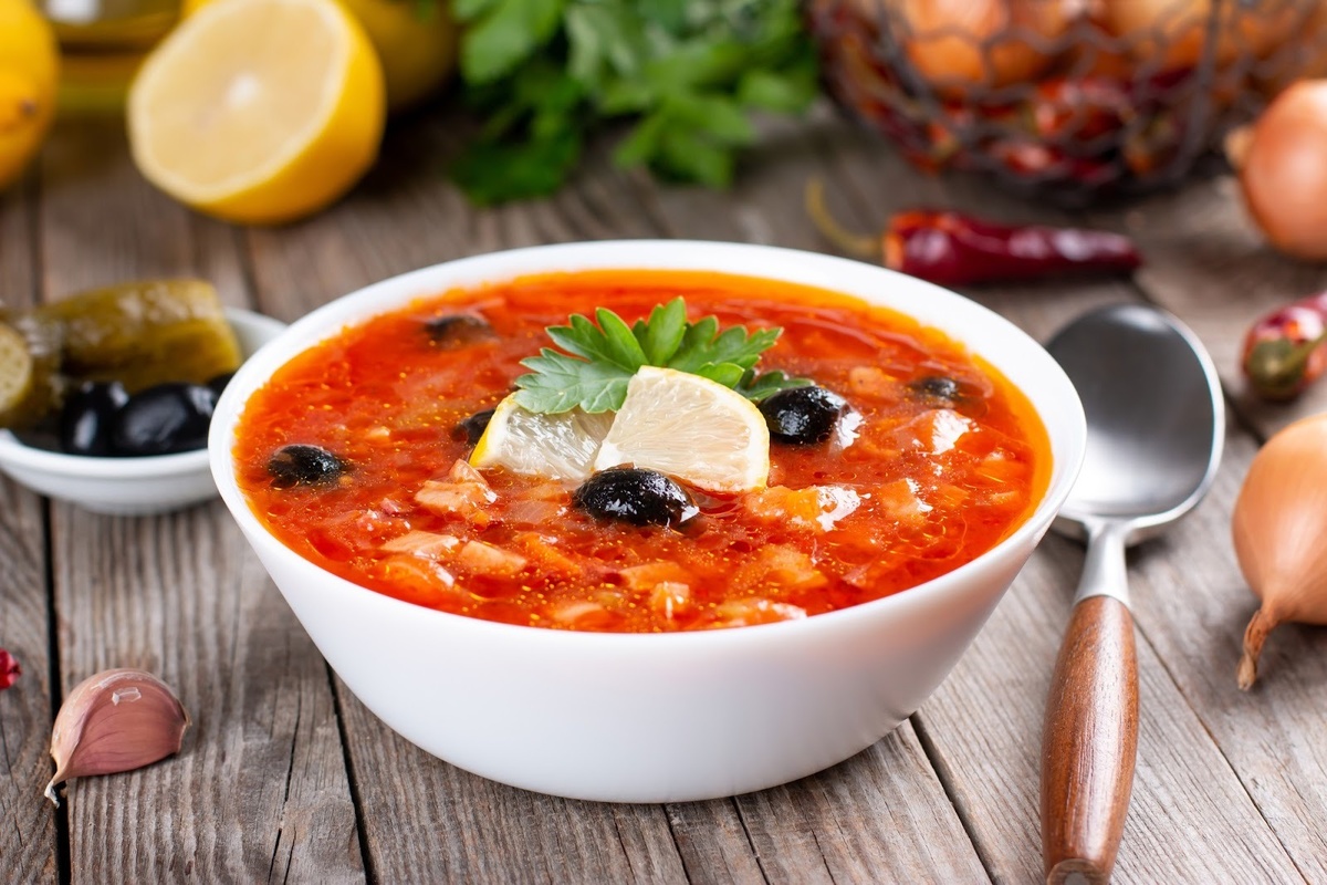 - Подаётся приготовленная солянка с лимоном и с маслинами.