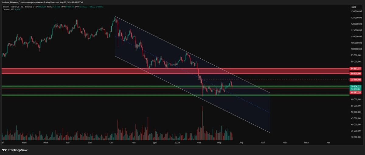#BTC Потрогали 75 и отбились. Пока такие мысли, что будет возня до тех пор пока цена не доберется до верхней границы канала. Причём это может произойти просто боковиком и потом по идее будет спуск к нижней границе.