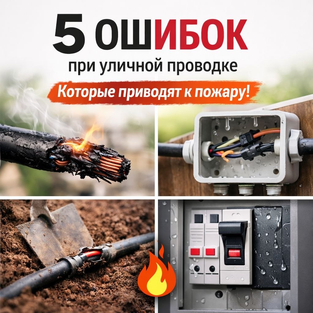 Улица — это влага, солнце и перепады температуры. Ошибки тут быстро превращаются в проблему 👇 ❌ Обычный кабель Разрушается от солнца и влаги → пробой ❌ Скрутки без защиты Окисление → нагрев → короткое ❌ Кабель просто в земле Повреждения + влага → быстро выходит из строя ❌ Нет УЗО Риск удара током и утечек ❌ Щиток без защиты Конденсат и вода → постоянные сбои ⚠️ Итог: Большинство проблем — из-за влаги и плохих соединений 👉 Сделал правильно — работает годами 👉 Сделал «на авось» — переделка ⚡ Вопросы и сотрудничество: Telegram: @help_electrik WhatsApp: +7 967 110-14-11