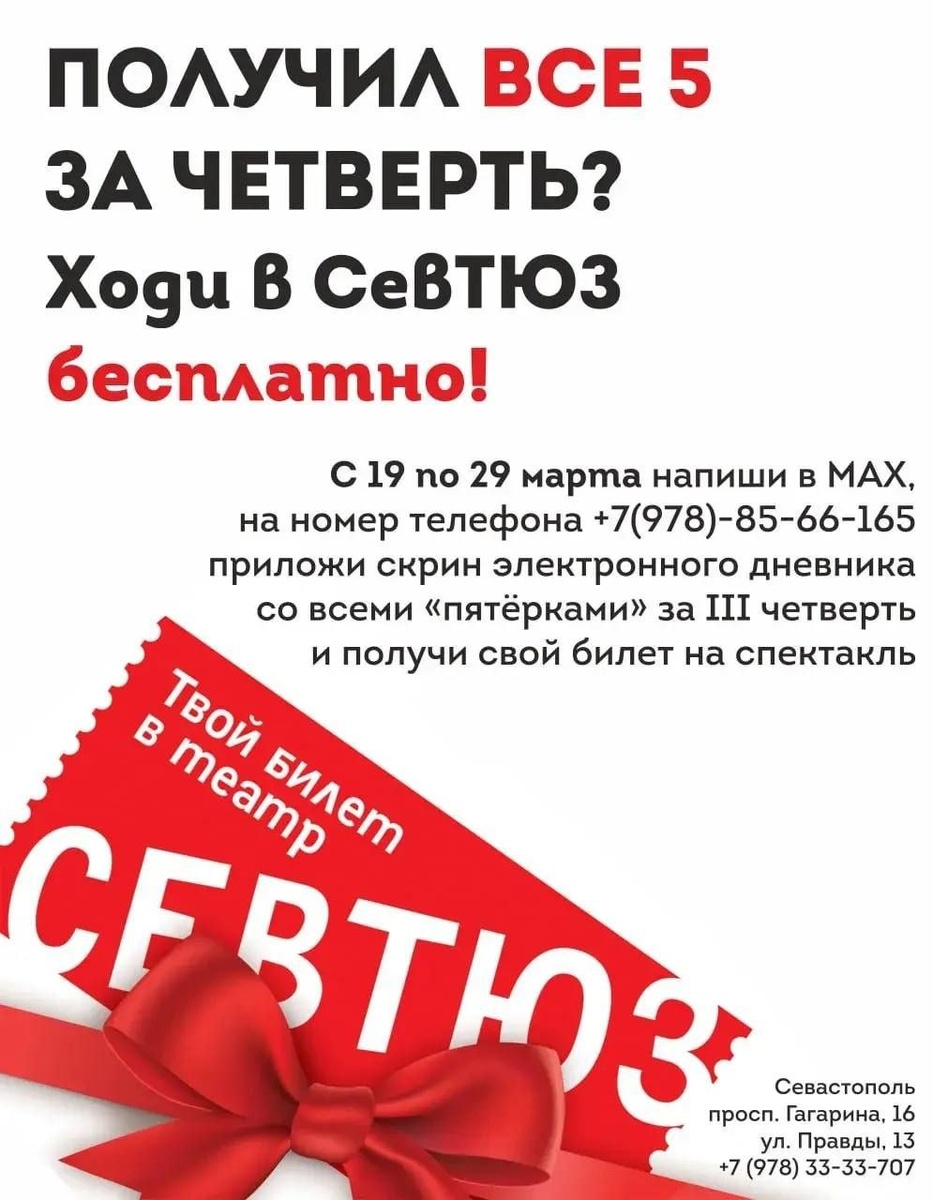 Севастопольский театр юного зрителя возобновил акцию «Билет за пятёрки» для школьников 1–11 классов, завершивших третью четверть с отличными оценками. Акция приурочена к весенним каникулам и продлится с 19 по 29 марта, сообщил губернатор Михаил Развожаев. Чтобы получить билет, нужно отправить скриншот электронного дневника в мессенджер MAX на номер +7 (978) 85-66-165. После проверки участникам предоставят электронный билет на один из спектаклей репертуара. Количество билетов ограничено. Акция действует только один раз на участника и не суммируется с другими предложениями. 📺 СТВ в MAX