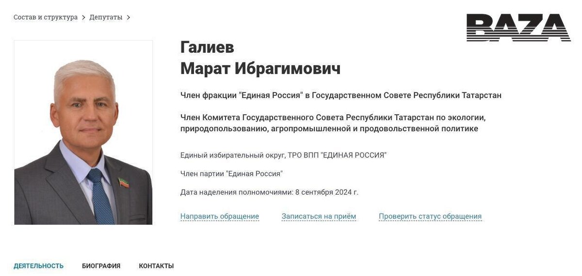 Депутат Госсовета Татарстана пытался засудить их за вскрытые нарушения в деятельности его предприятия. Депутат Госсовета Татарстана Марат Галиев стал автором громкой законодательной инициативы — предложил ограничить возможность проведения журналистских расследований и проверок, а также запретить писать «по мнению», «источники сообщают» в обвинительном контексте до вступления решения суда в законную силу. «База» изучила биографию и деятельность депутата, чтобы понять, чем так сильно его обидели журналисты и их расследования. Марат Галиев — фигура в республике известная. В официальной биографии указано, что он начинал карьеру как помощник машиниста буровой установки, затем занялся коммерцией и в итоге пришёл в политику. С 2019 года он является депутатом Госсовета Татарстана, где входит в Комитет по экологии, природопользованию, агропромышленной и продовольственной политике. На партийных сайтах и в официальных справках Галиев позиционируется как борец за чистоту окружающей среды: проводит
