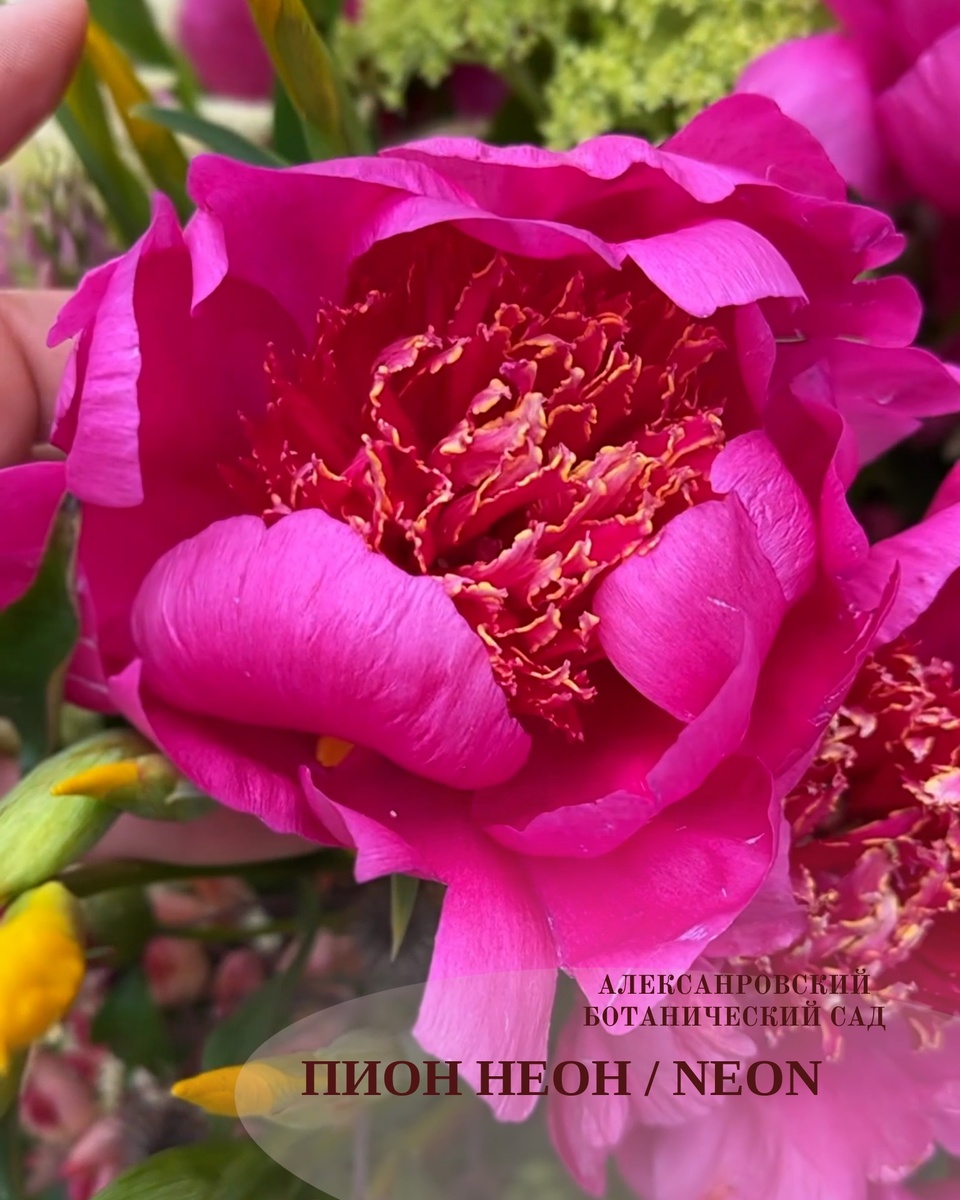 Пион "Neon" (НЕОН) - травянистый пион американской селекции 1941г. Авторство принадлежит Nicholls. На территории родной страны для этого сорта чаще используется англоязычное наименование Neon. Широко распространенный сорт за рубежом и в нашей стране. Позднецветущий. Цветок японской формы с 1-2 рядами широких ярко-розовых лепестков, окружающих центральный шар из розово-золотистых стаминодий (видоизмененных тычинок). Куст высокий до 90-110 см .Также отмечают его устойчивость к различным пятнистостям. Прекрасный ландшафтный пион, притягивающий взгляды издалека! Неон имеет весьма выраженный аромат, что не так часто встретишь и цветков японской формы.