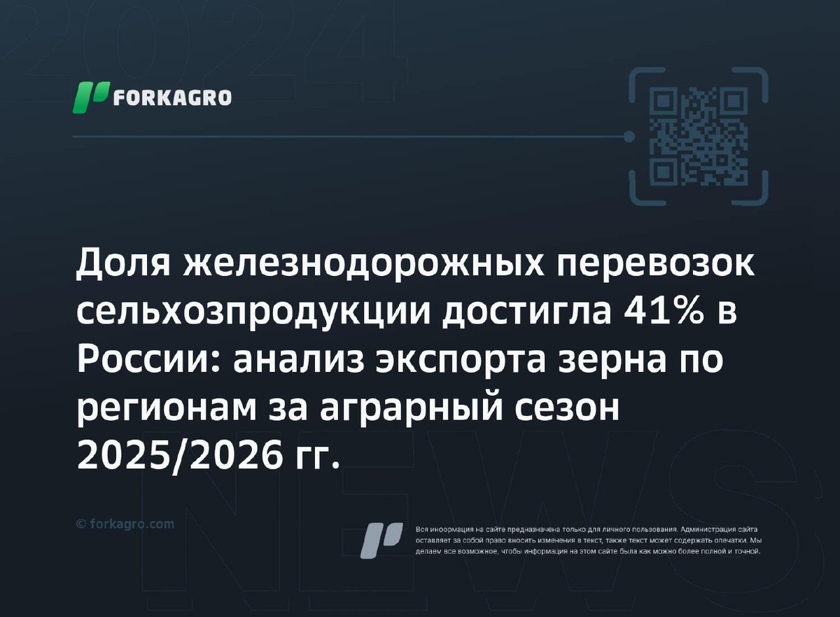 С начала текущего аграрного сезона доля железнодорожных перевозок сельхозпродукции в экспорте России достигла 41%. Отгрузки зерна по ж/д составили 16,9 млн тонн, превысив прошлогодние показатели. Рост перевозок связан с урожайностью в Поволжье, Центре и Сибири. Сибирский округ показал наибольший прирост, экспортировав 3,95 млн тонн зерна. Центр и Приволжье также увеличили объемы отгрузок. Перейти к источнику