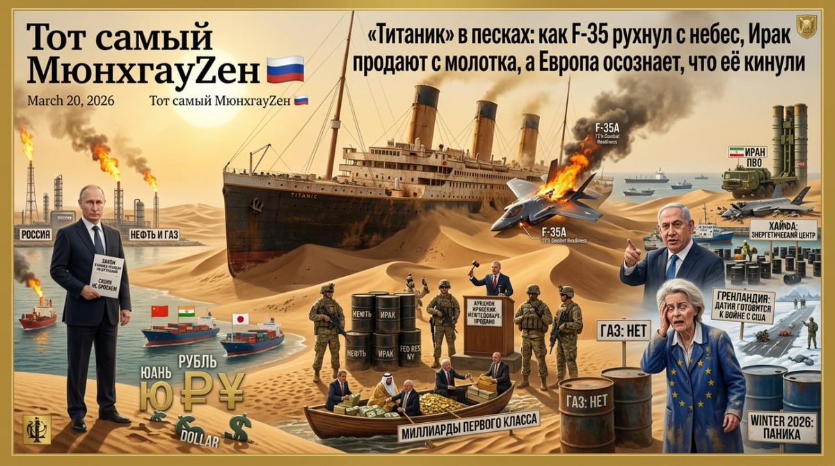 🚨 «Титаник» в песках: как F-35 рухнул с небес, Ирак продают с молотка, а Европа осознает, что её кинули Пески Аравийской пустыни вновь втягивают в себя обломки очередной имперской авантюры. То, что зачиналось в Вашингтоне как «маленькая победоносная война» с громким именем «Эпическая ярость», стремительно обрастает чертами классической катастрофы — с той лишь разницей, что «Титаник» тонет не в ледяной воде Атлантики, а в раскалённом мареве Ближнего Востока, и пассажиры первого класса уже спешно грузят на шлюпки свои миллиарды, оставляя команду разбираться с пробоиной. Картина, открывающаяся сегодня достойна не столько пера историка, сколько кисти художника-сюрреалиста. Самый дорогой игрушечный самолётик Пентагона, гордость корпорации Lockheed Martin, нахватанный стелс-технологиями так, что не летает, подбит иранским комплексом ПВО, который «по инструкции» не должен был его даже заметить. Иранцы, эти «неразумные аборигены», просто не знали, что F-35 — невидимка, и потому преспокойно