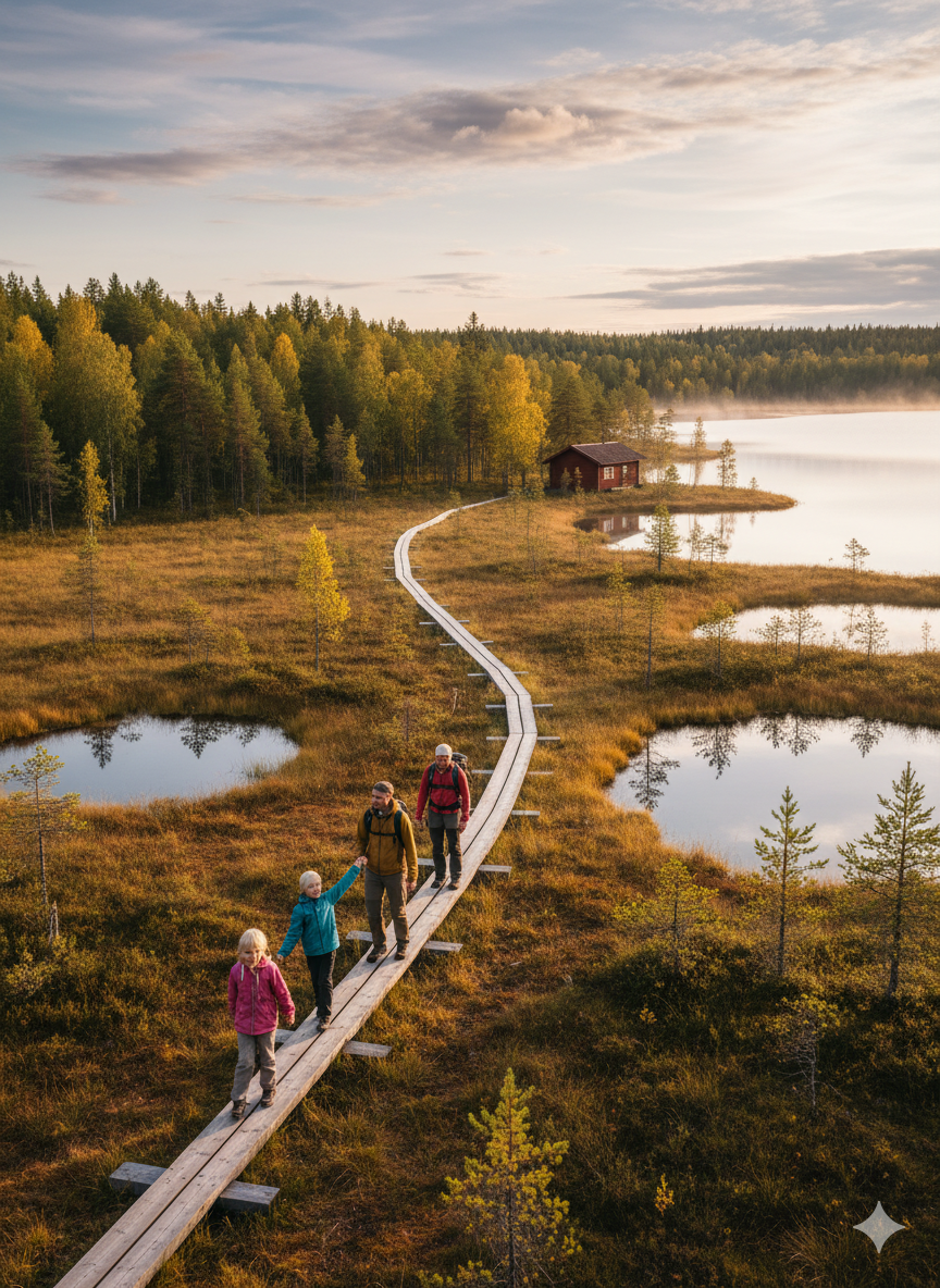 Маршруты рассчитаны на любой уровень подготовки — от коротких прогулок по часу до полноценных многодневных переходов. Летом купаются в озёрах и ловят рыбу, зимой ходят на снегоступах и катаются на лыжах. Костровые места оборудованы вдоль троп, и приготовить на открытом огне сосиску или рыбу — стандартная финская программа отдыха на природе.