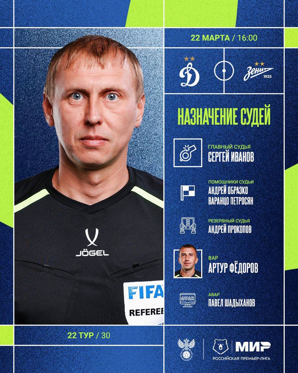 Сергей Иванов назначен главным арбитром матча 22 тура Мир РПЛ #Динамозенит Судья на VAR — Артур Федоров. Матч покажут по беслатному каналу Матч ТВ. Комментаторы – Трушечкин и Жичкин. Встреча начнется в 16:00. ⚽️ Подписывайтесь на БуДсу!