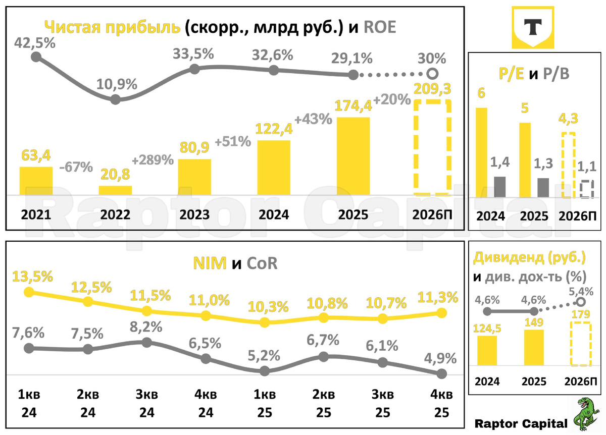 📌 Вчера Т-Технологии опубликовали отчёт по МСФО за 2025 год и провели звонок с инвесторами, делюсь подробностями и моим мнением об акциях компании. • Из трёх видов чистой прибыли в пресс-релизе больше всего должна интересовать скорректированная (прибыль акционеров без учёта доли в Яндексе). Она выросла на 43% до 174,4 млрд рублей, свой прогноз по росту на 40% выполнили. На 2026 год дали консервативный прогноз по росту прибыли на 20% (как и у Яндекса, видим на графике замедление темпов роста: 51% > 43% > 20%). • В структуре чистой выручки (выросла на 36% до 738 млрд рублей) следующие изменения: снизилась доля розничного кредитования с 43% до 41%, снизилась доля страхования с 10% до 8%, выросли доли корпоративного бизнеса и малого/среднего бизнеса на пару процентов. При этом в рублях выручка по всем сегментам выросла, что похвально в период жёсткой ДКП. • Рентабельность капитала (ROE) ожидаемо снизилась из-за поглощения Росбанка с 32,6% до 29,1%, без Росбанка ROE была бы 32%. На 2026 го