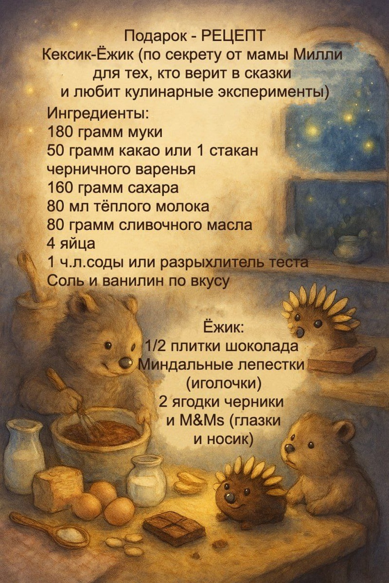 Инструкция: Замешиваем «волшебство»: Смешайте ингредиенты из раздела Тесто. Тесто должно стать , как ночь в Вомбат-граде! (но можно оставить светлым без какао) Добавьте гашёную соду или разрыхлитель-пусть «оживёт» и пузырится, как болото ёжика Ёрика. Выпекаем «норку»: Разлейте тесто по формочкам (лучше маленьким — как следы вомбата), предварительно смазать стенки формы кусочком сливочного масла. Выпекайте 20-25 минут при 170°C. Готовность проверяйте палочкой-светлячком (если сухая — можно вынимать!). При отсутствии формочек, время выпечки кекса в большой форме увеличивается до 60 мин. Внимание! Время выпечки зависит от духовки🥰 Создаём ёжика: Растопите шоколад и обмакните верх кексика. Пока шоколад не застыл, воткните миндальные «иголки» веером. Добавьте глазки из черники. Секреты от мамы Милли:Если тесто слишком тёмное — добавьте ложку мёда, «чтобы подсластить обиду». Нет миндаля? Используйте подсолнечные семечки — будет ёжик «в деревенском стиле». Для вомбатского эффекта — посыпьте